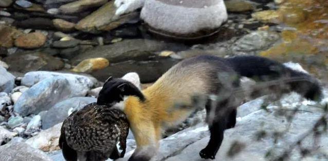 更厉害的是,它们连毛冠鹿都敢惹。有次,一头毛冠鹿到溪边喝水,压根没察觉危险。两只黄喉貂早埋伏好了,公貂冲上去一个翻滚,把鹿掀翻,咬住喉咙,母貂从后面咬住鹿腿。鹿挣扎半天,还是没逃掉。